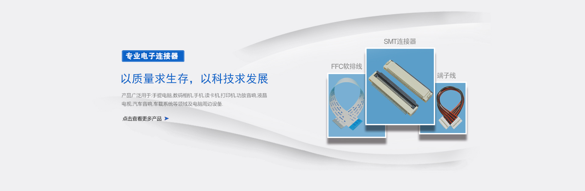 經(jīng)營(yíng)項(xiàng)目:FPC連接器、接插件、光纖連接器、FFC排線(xiàn)、端子線(xiàn)束等。間距有:0.3mm/0.5mm/0.8mm/1.0mm/1.25mm/1.5mm/2.0mm/2.54mm/3.96mm.......并可以為您開(kāi)模定制各類(lèi)精密連接器及配套線(xiàn)束.
